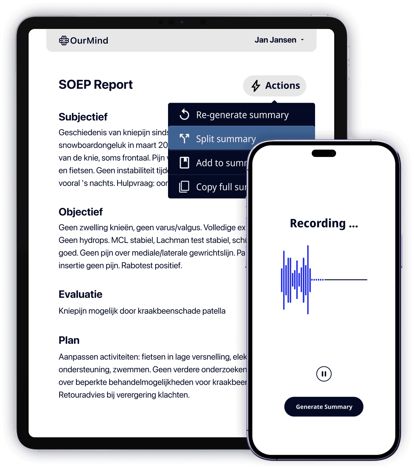 Met OurMind kan ik het hele consult echt contact met de patiënt houden, maar beperk ik het uitlopen doordat er een fantastisch en correcte SOEP voor mij gemaakt wordt, inclusief DD, hoe gaaf is dat!